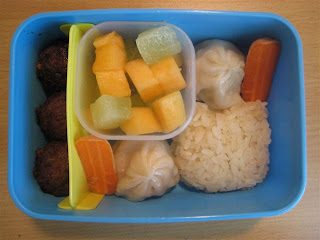 To the left, 3 sweet & sour meatballs. On the right, a Hello Kitty shaped rice mold, 2 steamed pork dumplings, a cup of mixed melons and a couple of carrot sticks to hold it all in place.