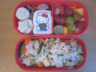 She has a green salad with lettuce, cucumbers, carrots, shredded turkey & swiss. Top tier has some turkey & cheese flower sandwich bites, Koala chocolate cookies, the HK container holds ranch for her salad, and a mixed fruit salad (grapes, strawberries & canteloupe).