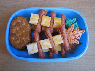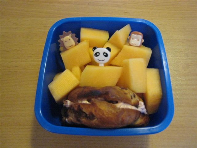 On Monday, Ben wanted to use some more of his new animal picks, so he picked a cinammon raisin bagel with strawberry cream cheese and "lots of melon!" (canteloupe) along with his monkey, lion & panda picks. :o)