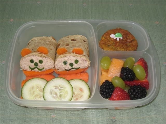F&B had tuna salad wraps on multigrain tortillas with carrot ears and cucumber faces (much easier than I thought too!). I had a cookie cutter that had tiny circle cutouts, but I think you could use a straw. The mouths are just a heart cookie cutter used twice to get the shape.