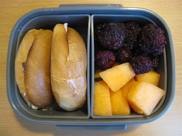 From our "in the kitchen & ready to eat" food group, Ben chose a mini bagel toasted with strawberry cream cheese, cantaloupe & blackberries. Certainly enough to tide him over for a couple of hours.