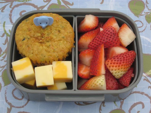 For today's snack, Ben took one of the muffins, a few chunks of "Canadian" cheese for extra protein (Nana brought us a bunch and it is better than Texas grocery store cheese) and a bunch of freshly sliced strawberries.