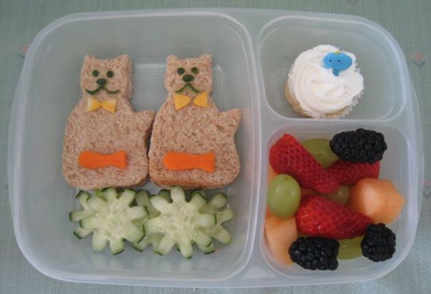 Faith had two kitty sandwiches (Nature's Own Whole Wheat Bread, turkey, cheese) with cucumber features, a cheese bow and a carrot fishie! She also had cucumber stars, mixed fruits (strawberries, grapes, cantaloupes & blackberries) and a mini vanilla cupcake. It's packed in our EasyLunchboxes since two of those fit in their cooler with drinks. There's a link on the sidebar if you'd like to order your own set too.
