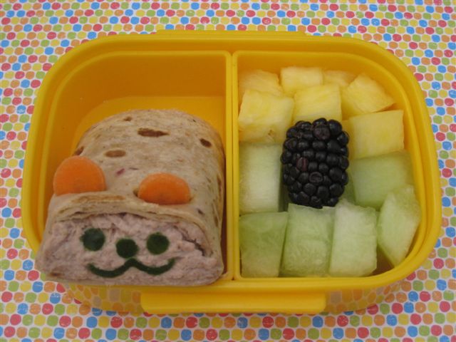 Mr. Ben has a mouse-wrap of tuna salad on multi grain tortilla with carrot/cucumber decorations, and a fruit salad with pineapple, honeydew and a nice plump blackberry for color!