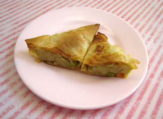 [Now, the original recipe called for some kind of dough. Since I didn't know what exactly that was, and my kids like the flaky pastry type dough, I used phyllo dough.]
