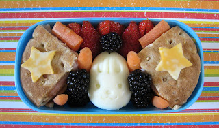 Benjamin has a turkey & cheese sandwich on Nature's Own Multigrain Sandwich Thins (yes, I'm still extolling the virtues of this bread, we love it!). I quartered the sandwich so it fit better into the box, but nothing fancy with it. It's topped with 2 marble cheese stars, my only foray into "work" other than actually making the meal today. There is a bunny shaped hard-boiled egg in the center, but those aren't really work, just peel sooner than later. ;o) He has sliced strawberries, fresh blackberries, and baby carrots to fill in all the gaps.