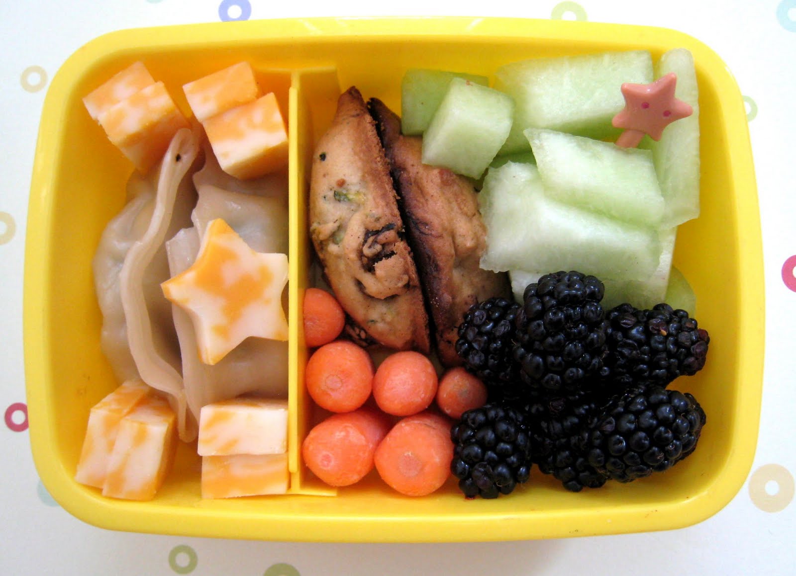 For lunch, the kids had the dumplings, some marble cheese (about 1 oz worth, I measured because I was curious), carrot sticks, honeydew, blackberries, and a zucchini raisin cookie.