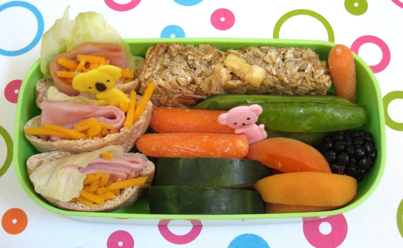 Miss Faith opted for ham, cheese & lettuce sandwiches in mini-pita pockets, carrots, cucumbers & a new favorite pea pods, apricots & a blackberry, and some of the apple-cinnamon granola bars I made a few days ago.