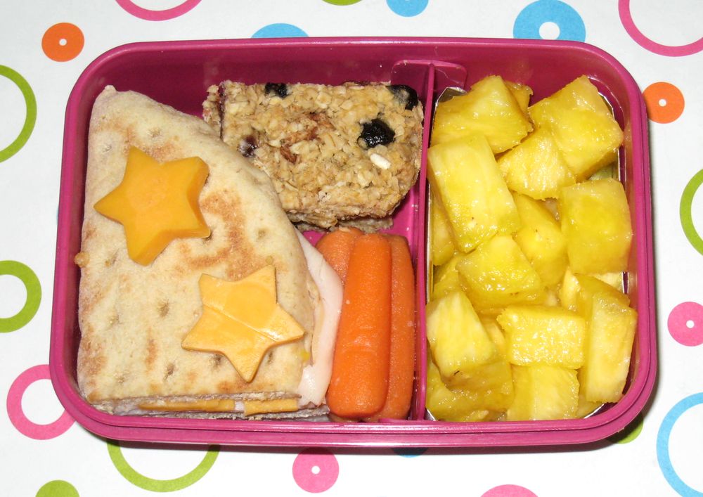 Faith has a turkey & cheese sandwich on whole grain flat bread with a couple of cheddar stars on top (I couldn't have no single cute thing in the box!). She has some carrot sticks, homemade strawberry-blueberry granola bars and diced pineapple.
