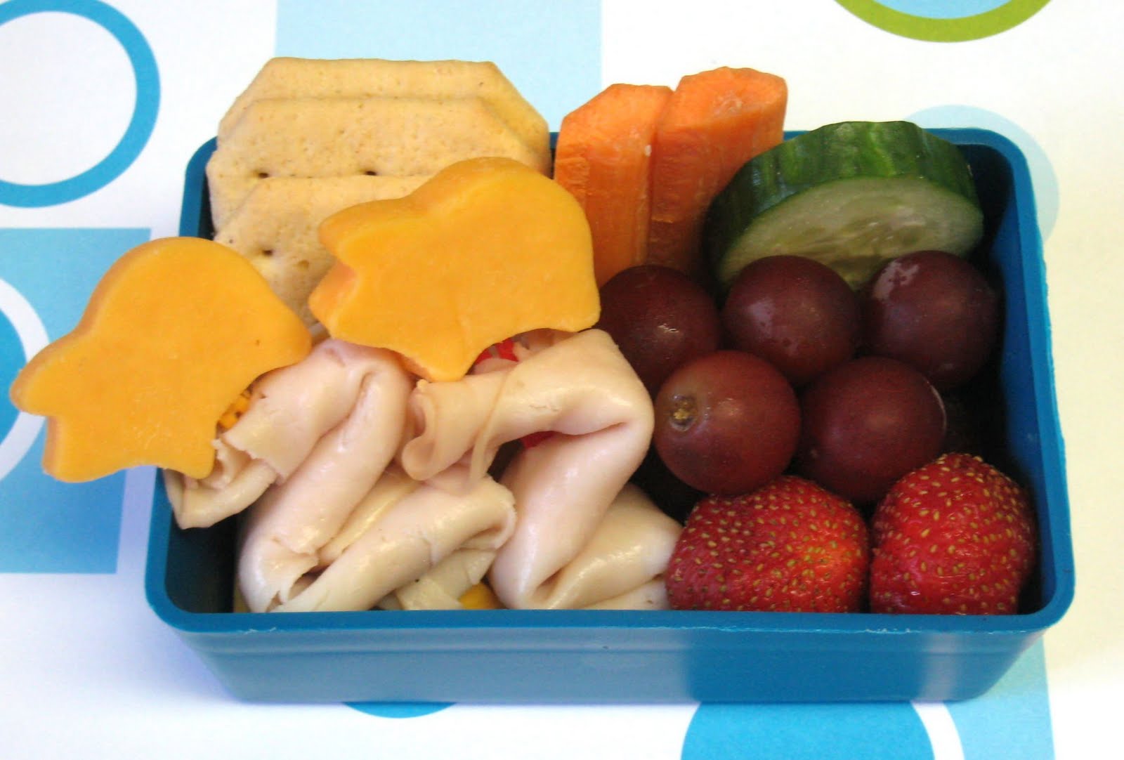 The kids had a few crackers, deli turkey with piggie shaped old cheddar cheese, carrots, a cucumber, grapes and a couple of strawberries.