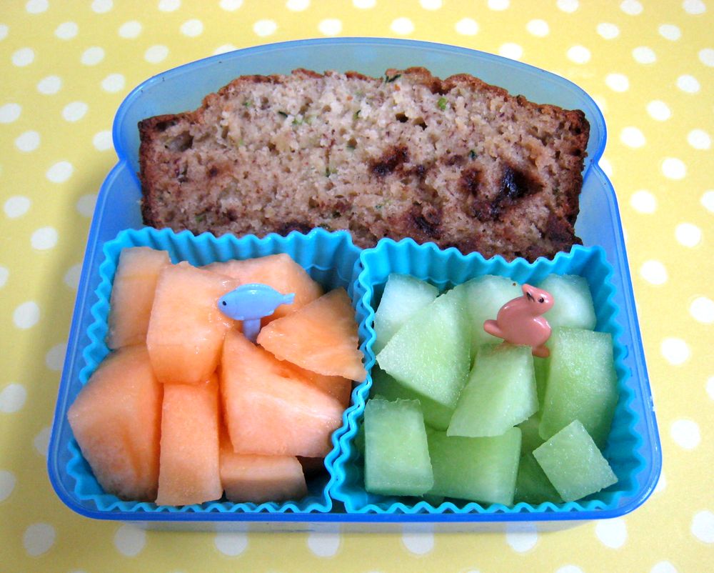 To that, we added a slice of homemade banana-zucchini bread that we also made on Monday, and some freshly sliced cantaloupe and honeydew. I added a couple of picks for at least a little cuteness. :o)