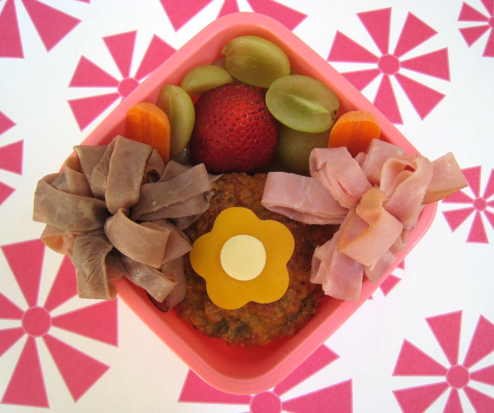 Faith has a taco muffin, topped with a cheese flower, a ham flower, a roast beef flower (I think the roast beef looked better in the box), some grapes, strawberry and carrots.