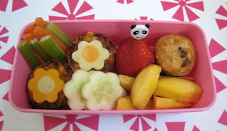 Faith had a couple of mini quiches, topped with cheddar flowers, some celery & carrot sticks, cucumber flowers, peach slices, a strawberry, and a mini muffin bite. While the oven was already on, I made the kids some mini-muffins too.