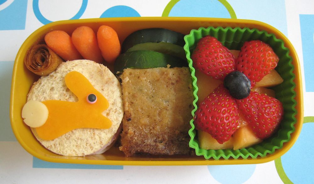 Today's a cute little bento for Faith, she helped pick what she wanted. She has a triple decker sandwich--ham, turkey, cheese, and the carrot-ginger spread, on Nature's Own Honey Wheat. I cut three circles from the bread to make a thicker layered sandwich and topped it with a cheddar bunny with a white cheddar cotton tail. ;o) She also has some carrot sticks and cucumber, a homemade peach-apple fruit roll up, the last garden zucchini bar, cantaloupe, topped with a sort-of flower made from strawberry slices with a blueberry center.