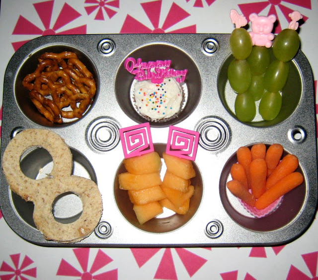 Faith has a sandwich, shaped like an 8 (cut freehand, mind you, so be sure to ooh & aah). It's made of Nature's Own 7 Grain Honey Wheat and filled with blueberry cream cheese. She has 8 pretzels, 8 chunks of cantaloupe, 8 grapes, 8 carrots, and a mini muffin/cupcake with vanilla icing, sprinkles and a Happy Birthday pick. Because being 8 is too important not to celebrate all day long!