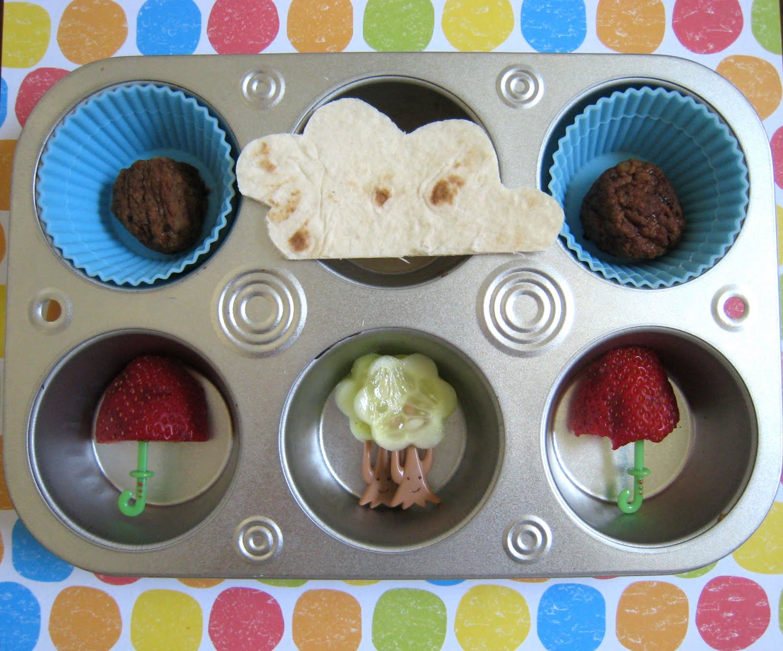 In the tin, we have a couple of meatballs, a tortilla cloud (did you know you can cut a tortilla with scissors? you can), strawberry umbrellas and cucumber trees.