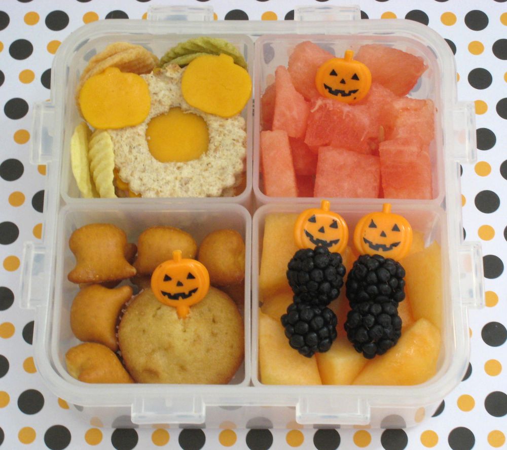 Mr. Ben was the official taste tester/sampler. He had the linzer sandwiches--ham & cheese on Nature's Own Honey 7 Grain bread, which happens to be my current favorite. He has a few extra cheese pumpkins and a few veggies chips. Below that, he has a mini muffin and some Pucca fish I bought at Minoya the other night. To the right, he has watermelon from our garden, cantaloupe from the grocery store, and a few blackberries, all accented with some cute pumpkin picks, from the Dollar Tree!