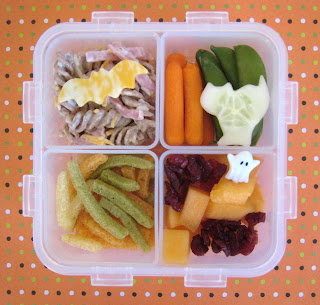 Faith has a pasta salad (trying out Jovial Einkorn pasta) with ham and cheese, topped with a marble cheddar bat. She has carrots, peapods and a witch's cat made of cucumber, some cantaloupe and dried cranberries with her spooky little ghost pick, and some veggie straws.
