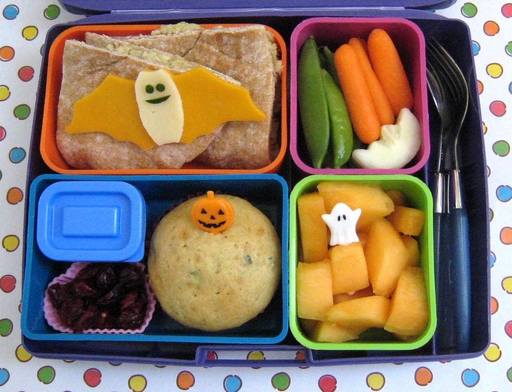 Faith had a honey grain sandwich pocket, cut in half, and stuffed with the pesto chicken salad. It's topped with a Halloween bat made of orange cheddar cheese with a white cheddar body. To the right of that, she has fresh peapods, baby carrots and cucumber moons (the moon cutter was perfect, two per slice and almost no waste). Below is cantaloupe with a ghost pick and to the left is a container of dip for the veggies, dried cran-cherries and a homemade zucchini-chocolate chip muffin that *Faith* made this afternoon while I was making the chicken salad. She was able to follow the whole recipe on her own and they turned out wonderfully!