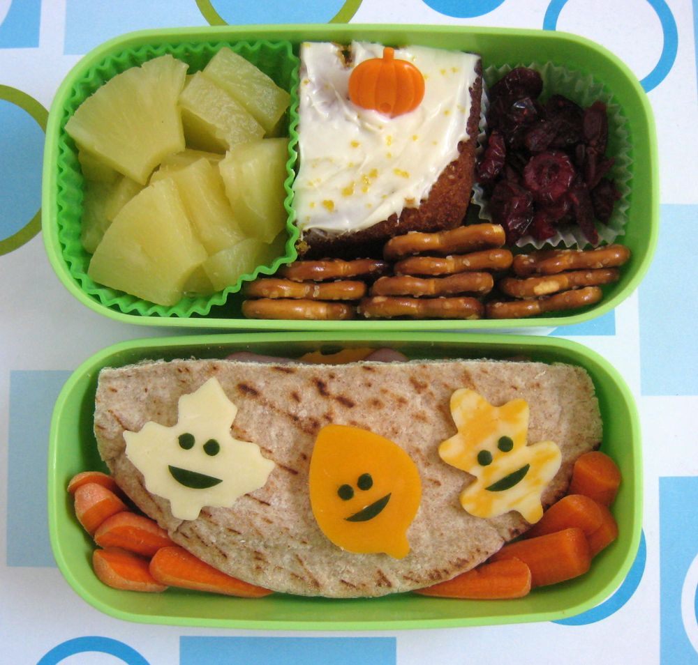 We used two tier bentos today. The bottom tier holds a sandwich pocket (new kind, Honey Grain, forget the brand name) stuffed with ham, cheddar and herb & chive cream cheese. I did have to take a teeny bit out of the corners so they fit in the box. The sandwich is decorated with some happy falling leaves of assorted cheese with cucumber faces, and a few baby carrots help hold it in place. Quick trick--tiny dots of cream cheese, tip of a toothpick sized, help hold decorations in place!