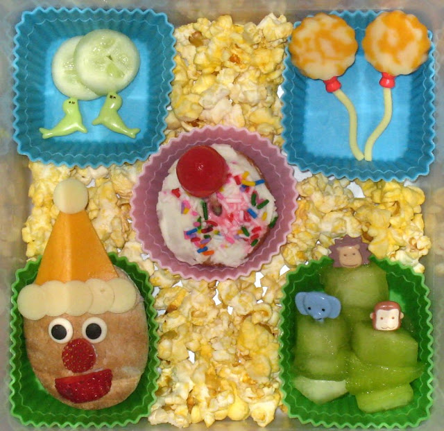 The picture didn't turn out quite as well as I hoped, this is actually the inside of one of those big square red/white striped popcorn buckets. We have two seals balancing cucumber balls on their noses, two flowery cheese balloons, a mini pita pocket clown sandwich with strawberry mouth and nose, sugar eyes and a cheese hat, circus animal kebab sticks with honeydew, a really festive cupcake thingie (leftover from Faith's birthday at church), and a layer of popcorn. It did look really cool in the bucket!