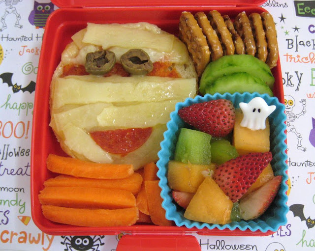 Faith had a muffin mummy pizza--I used white cheddar pieces for the bandages, a couple of olives for the eyes and a half piece of pepperoni for the smile. Very easy and the kids were amused. Faith also has some cantaloupe, honeydew and strawberry pieces, a few pretzels, cucumbers and carrot sticks. No sweets right now, we let the kids enjoy their Halloween candy on Halloween night, so trying to up the good food content before we head out trick-or-treating.