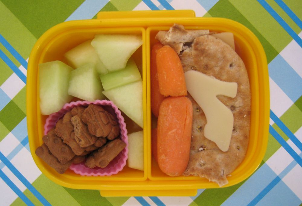 Faith has a sandwich on Nature's Own Multigrain Rounds. My assumption is turkey & cheese because I'm pretty sure we only have turkey open right now. She decorated it with a swiss cheese shoe. She has carrot sticks, honeydew and some teddy cookies in a silicone cup.