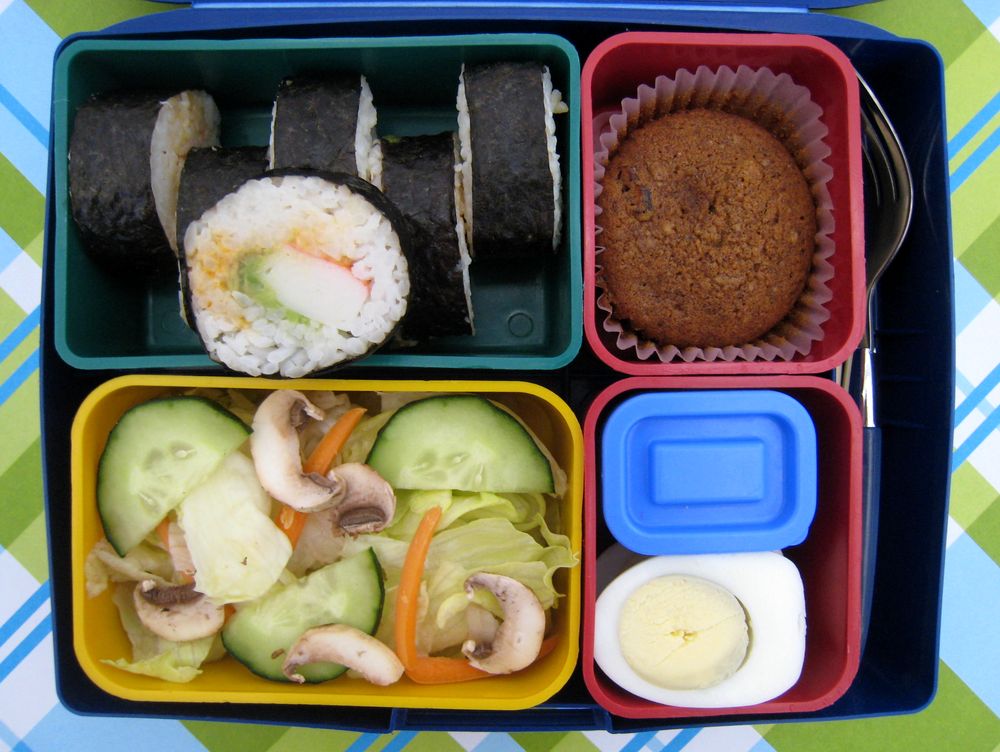 For lunch, the other day, we utilized some of the leftover sushi. Shaun took 6 of the big California rolls (these are the 2 inch diameter ones). The sixth piece got tucked into the box, but I had to pull it up for the picture since I'm really proud of my sushi. He had a chef salad (dressing at the office), a boiled egg, and one of Faith's cranberry-pear gingerbread muffins. The little blue container holds soy sauce for his sushi. It's packed in our Laptop Lunch box, due to the sushi needing to be separate from everything else.