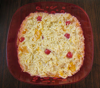 Combine orzo, fruit (drain cherries & oranges, and pineapple mixture.