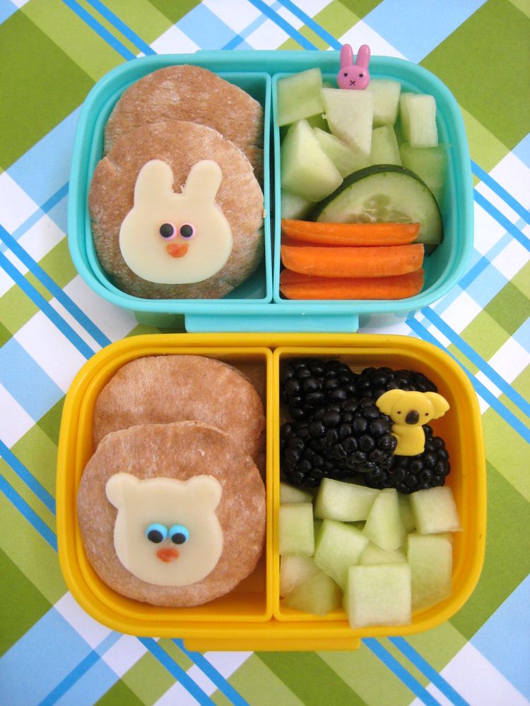 In this one, F&B had tuna salad in mini pita pockets topped with a cute cheese critter--bear for Ben, bunny for Faith. They both had honeydew, then Ben wanted blackberries and Faith wanted carrots & cucumbers, easy enough!