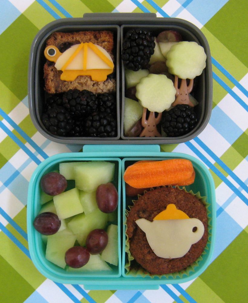 Ben has a piece of blueberry banana bread, topped with a cheese turtle, blackberries, honeydew and grapes. I saved a couple of uncut pieces of honeydew to make little trees for him.