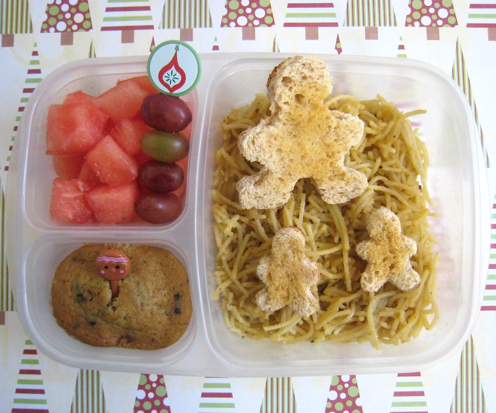 Faith has the aforementioned pasta, along with some gingerbread man shaped garlic breads (toaster oven, cookie cutter, bit of butter & garlic, and you've got really quick garlic toasts). Along with that, she has watermelon and grapes, along with a mixed berry muffin from my freezer stash. I love my freezer stash. I'm out of freshly baked sweets, but was able to defrost two muffins in a minute, and we've got lunch!