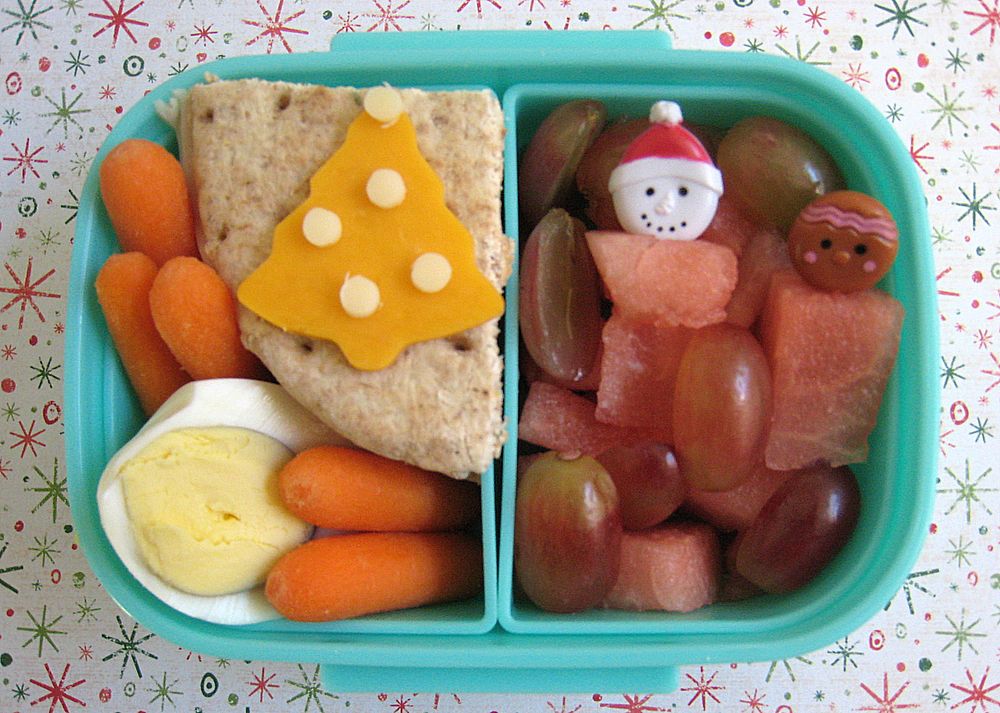For lunch today, Faith had a turkey and chive cream cheese sandwich, on Nature's Own Multigrain Sandwich Rounds, topped with a little orange cheddar Christmas tree. Since I was feeling extra creative, the tree is decorated with Swiss cheese ornaments. She also has half a boiled egg and some carrots, plus grapes and freshly picked and freshly sliced watermelon.