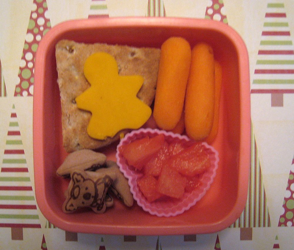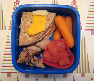 They both have cream cheese and strawberry jam sandwiches on Nature's Own Multigrain sandwich rounds, watermelon from our garden, baby carrots and a few koala cookies. She topped the sandwiches with Christmas decorations--a cheddar stocking with a Swiss cheese ruffle for Ben and a cheddar gingerbread girl for herself. I'm impressed!