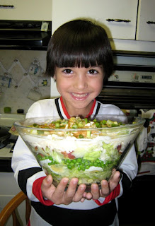 We are just finishing off our Canada trip, but Ben needed one more chance to cook with Nana, hence this week's The Kids Cook Monday! This layered salad was actually part of our New Year's Day dinner and Mr. Ben was quite proud of it--lots of opportunities for him to slice, dice, crumble and arrange the salad.