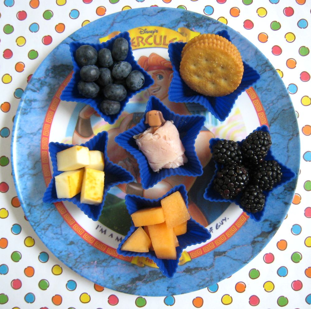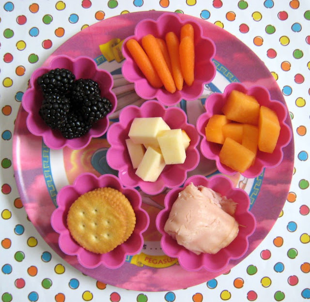 Ben has blueberries, blackberries, cantaloupe, muenster cheese, deli turkey and crackers today. Nothing fancy, the kids were "starving" and I wasn't feeling especially creative. Although, I learned that both of them apparently love muenster cheese, as they ate a half a block of it this afternoon.
