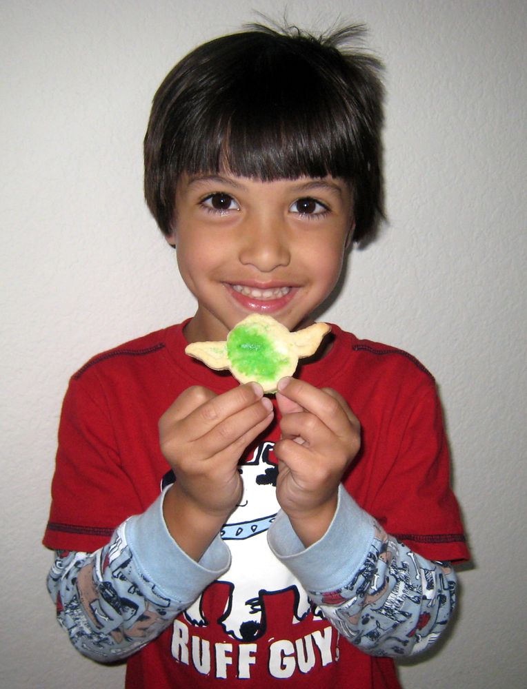 This would be a Yoda cookie, after icing and sprinkles.
