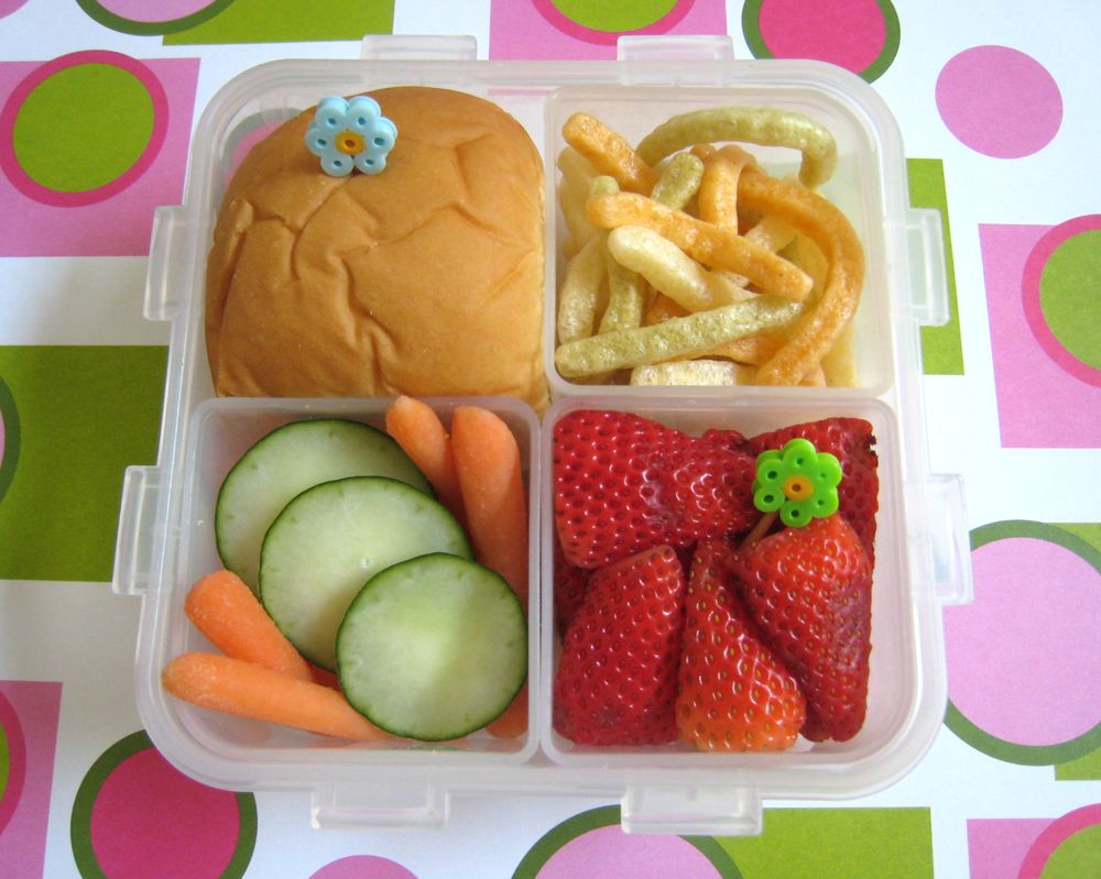 We had leftover mini buns, so we used those for sandwiches. She has turkey and cheese on one of them, along with veggies straws, freshly sliced strawberries, carrots & cucumber. It's packed in a 4 square Lock & Lock container with only 3 of the insets. The sandwich was slightly too large to fit in the 4th box but fit perfectly without it.