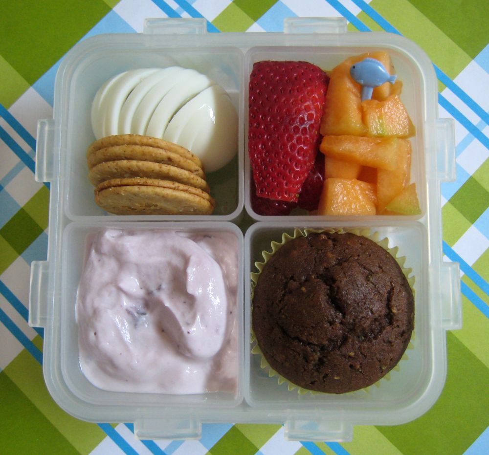But since swimming takes a lot out of you, we are looking for higher protein ideas (no PB please). Ben has a boiled egg with whole grain crackers, Greek yogurt (blueberry, of course), strawberries and cantaloupe, and homemade chocolate-zucchini muffins. We're out of cheese or I would have added a bit of that too.