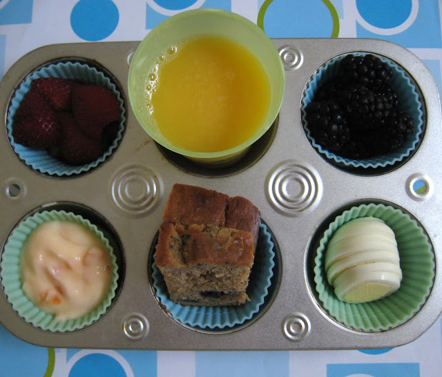 We have swim team this morning. We actually have swim team every weekday morning and I need to shower. And wash my hair. And generally get up and presentable for the day. And making breakfast is low on my agenda. So it's time for more muffin tin breakfasts! Take your tray out of the fridge, eat your food, put your tray in the sink, and don't interrupt Mommy while she's in the shower. Seems like a game plan to me!