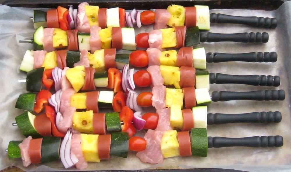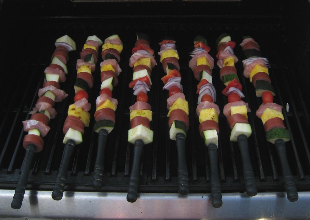 Sounded like a plan to me, and my parents have a big garden in the backyard that was already started to produce tomatoes, zucchini and peppers. And my dad did recently buy a pineapple for the kids. All this, plus a barbecue, means kebabs, of course!