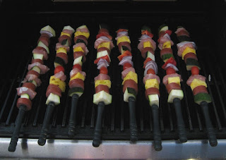 I had a plan in my head for how I wanted the kebabs to look and, other than the pineapple, the veggies are extremely locavore, right from my mom's garden. I sliced the tenderloin into four long quartered sections and cubed those to make the pork pieces, then sliced the sausage into rounds. The meat is alternated with a combination of pineapple, zucchini, cherry tomatoes, onion and red pepper, which started out just-so, and ended with a really odd last skewer of random things that were still on the plates.