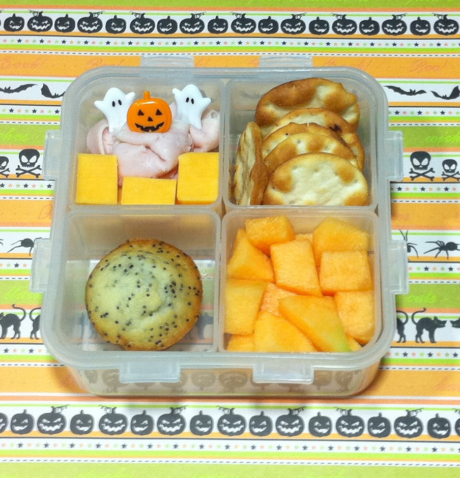 For lunch, Faith had deli turkey, skewered on Halloween picks and chunks of cheddar cheese. To go with that, she had pita crisp crackers, an almond poppyseed muffin and cantaloupe. She was *going* to have baby carrots to go with it, but she ate the bag of them while snacking & doing her homework. I suppose there are worse things in life than a child who eats a bag of baby carrots. ;o)