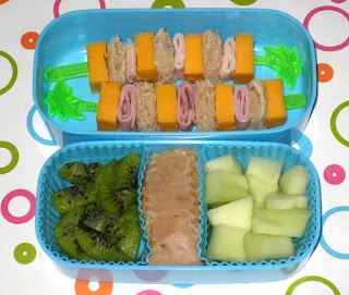 Today, Ben has sandwich kebabs with ham, turkey, cheese and bread. The picks are actually drink stirrers from the Dollar Tree last summer, keep an open eye shopping and you'll be surprised what works well to skewer food. Side dishes include kiwi, honeydew, and a piece of garden fresh zucchini bars I made last night, mostly to warm up the kitchen!