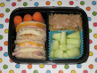 You may have to zoom in on the picture to see it better, I had to turn the sandwiches on their sides to fit into the box better. Ben has two mini sliders, skewered on a pick so they'd stay together. Side dishes include carrots, honeydew and zucchini bars; the box is a Monokuro Boo box that is neutral enough that Ben can use it too.
