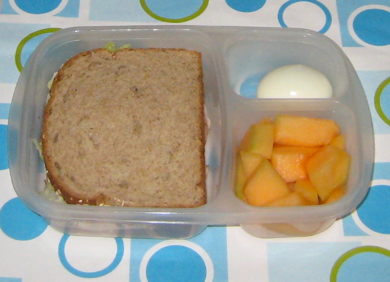 So this week, he's using our Easy Lunchboxes (also available on Amazon). In this one, he has a sandwich with Orowheat 12 grain bread, mayo, lettuce, pepperoni, ham, turkey, turkey pastrami, cheddar and provolone. Upper right is a boiled egg for extra protein, lower right is cantaloupe. He toted along a thermos of homemade chicken soup too.