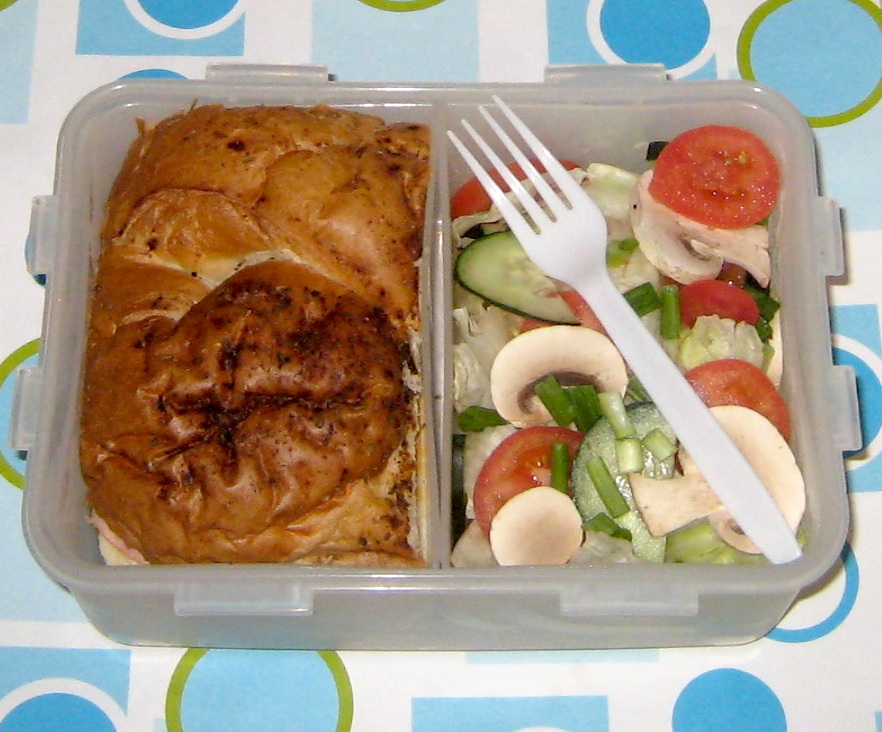 Let's see, this one has a sub sandwich on sun dried tomato bread--ham, turkey, turkey pastrami, pepperonis, mayo, couple kinds of cheese, lettuce, tomato, onion, etc. To the right, he has a chef salad with assorted veggies (I want to say lettuce, tomato, cucumber, onion, mushroom, maybe carrots?). He also had a thermos of soup that day, a chicken tortilla soup. The box is a jumbo sized Lock & Lock I've had for several years. The two inner containers lift out, so it's perfect if you have an item that needs to be reheated.