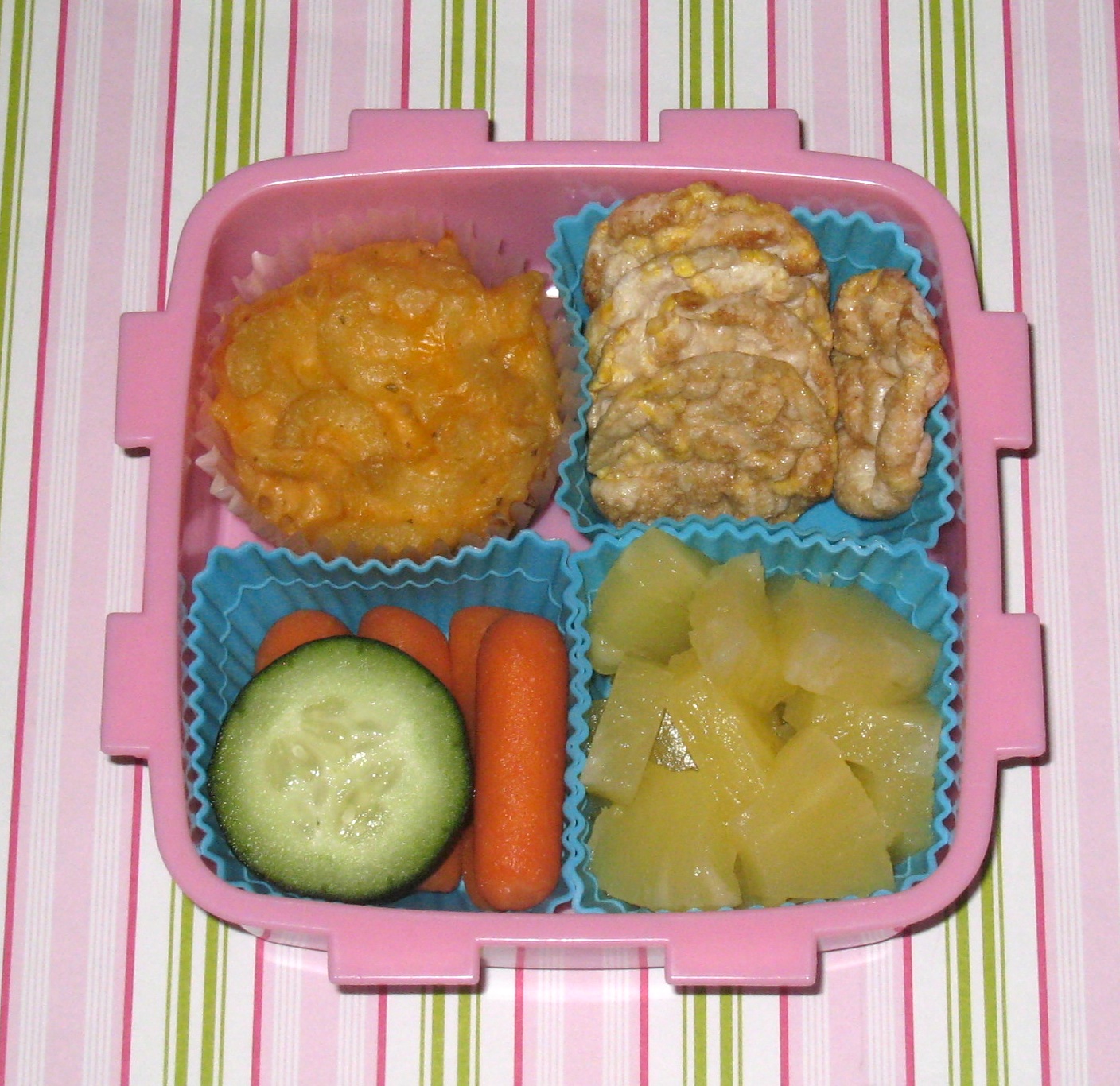 Today, Faith had a macaroni and cheese muffin, pineapple chunks, carrots & cucumber, and some creme brûlée crisps.