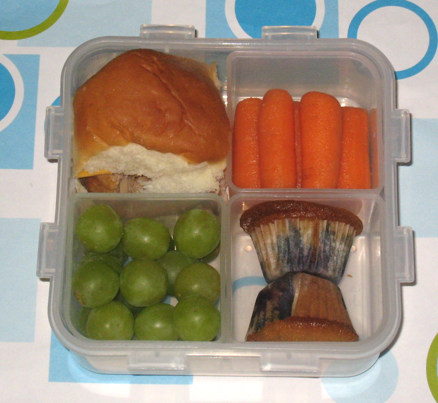 We also, obviously, took a break from the entrees muffins, I had two leftover mesquite BBQ pork sliders from the other night that we made, so each kid had one of those, carrots, grapes, and two mini blueberry muffins.