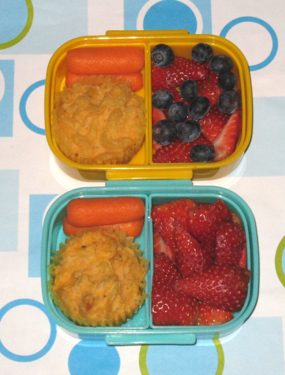 They had macaroni and cheese muffins, carrots, strawberries for Faith, strawberries & blueberries for Ben, and separate yogurt & granola containers. They ate, they enjoyed, and I didn't have to think about it, not too bad.